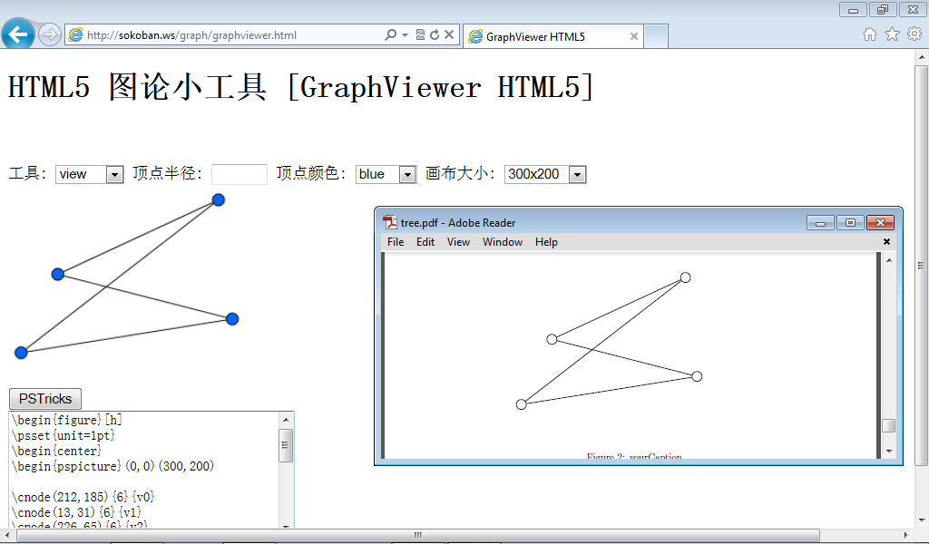 《HTML5图论小工具》是一个在线的所见即所得的图编辑工具,请使用支持HTML5的IE9,Firefox或Chrome等浏览器。在工具下拉框中选择不同的编辑模式。